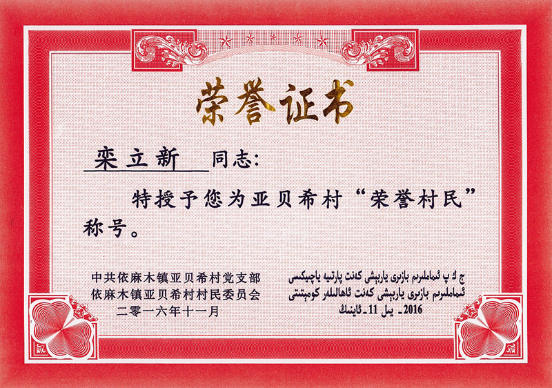 您现在的位置:新疆永利yl23411>> 关于永利yl23411>企业荣誉>董事长>> 亚贝希村荣誉村民