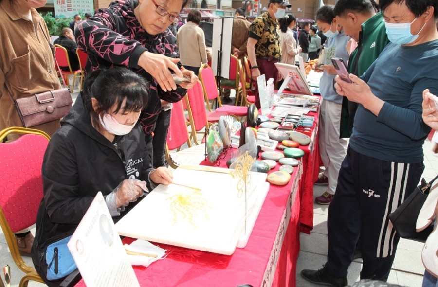 非遗民俗展示会汇集了乌鲁木齐市12个非遗项目,涵盖剪纸、调香、手工鞋、雕版拓印技艺、手工鞋、和田玉玉雕、错金银、石头画、蛋雕、纸塑、烙画技艺等非遗项目,展示了新疆非遗传统技艺、民族乐器制作技艺、传统美术、非遗文创产品等,让游客朋友们能够近距离感受非遗之美,并为游客呈现新疆民俗歌舞演绎,庆祝第13个中国旅游日。