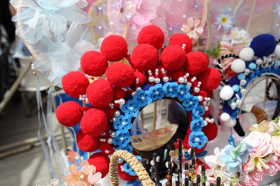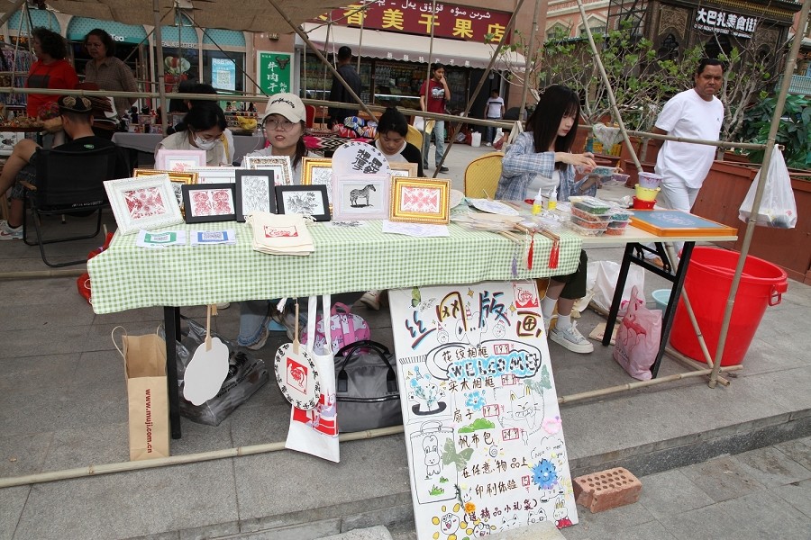 集市上,新疆好物、文创产品、手工饰品、香水、解压玩具、航天模型以及小吃等琳琅满目的商品,吸引了众多游客驻足观赏与选购。这些文创产品不仅具有浓厚的地域特色,还融入了现代设计元素,展现了非遗文化在现代生活中的新应用和新价值。