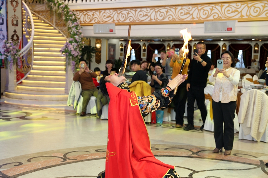 最后,冬季冰雪项目盛大启动,全体嘉宾与工作人员共同合影,为主体环节画上圆满句号。午宴期间,川剧变脸、喷火表演及歌手献唱轮番上演,嘉宾们畅叙合作、共话发展,氛围温馨而热烈。