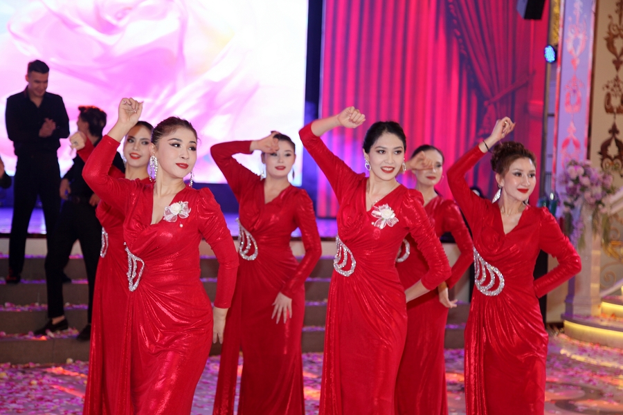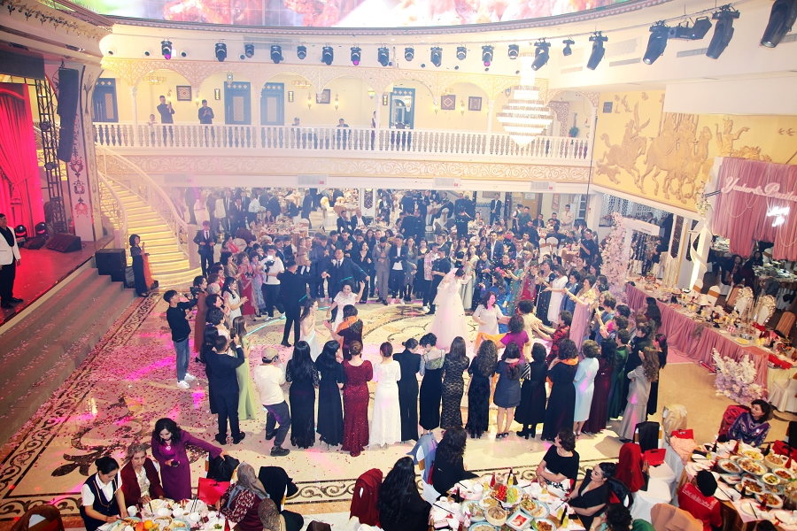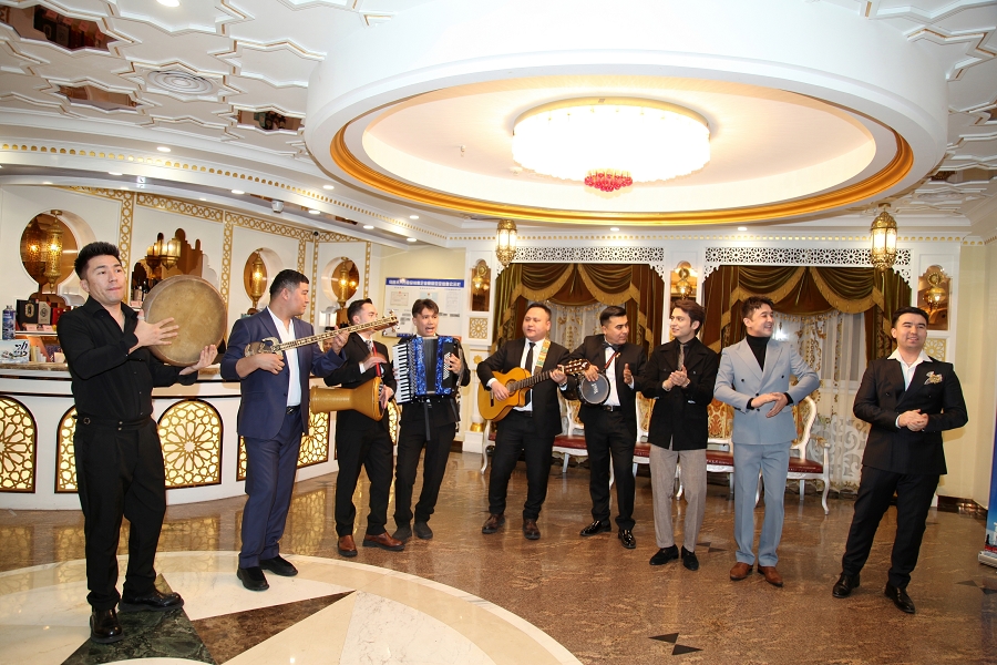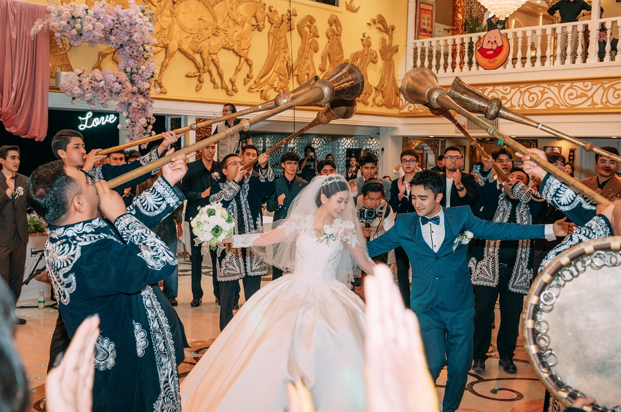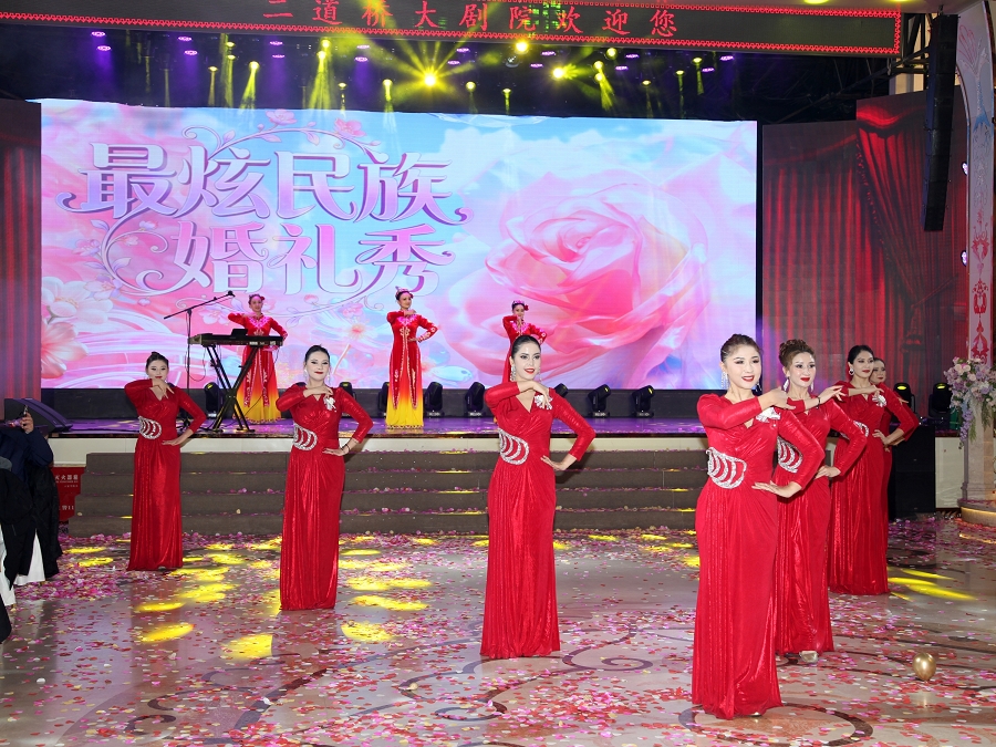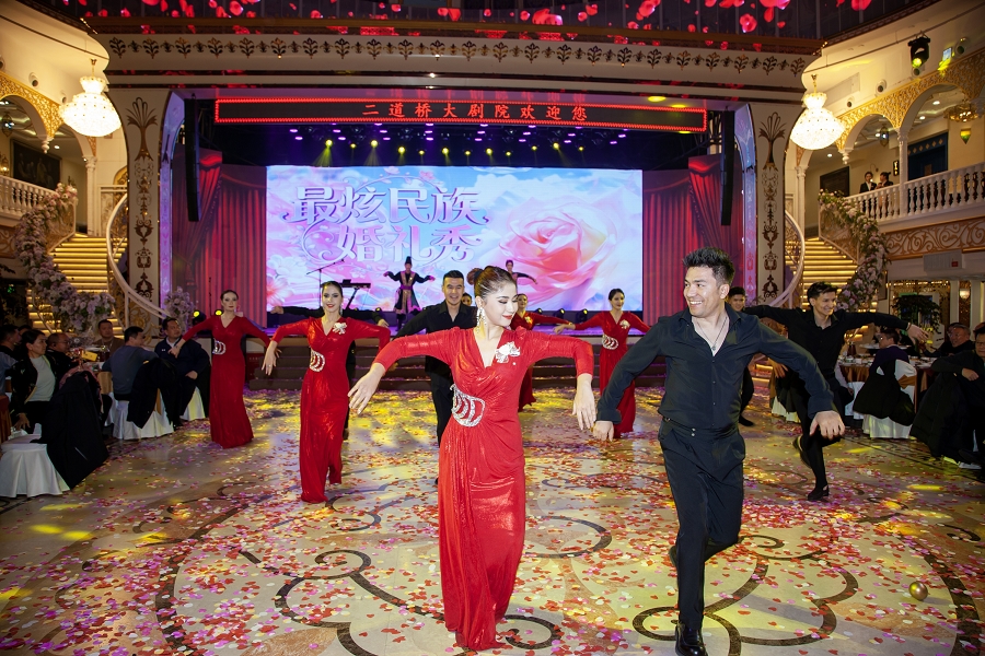 随后,阿凡提乐队奏响活力昂扬的曲目,传统手鼓的铿锵节奏、热瓦普的悠扬旋律与现代电音激情碰撞,独特韵律让现场氛围持续升温。身着民族特色服饰的伴郎伴娘率先起身,面带真挚笑容走向嘉宾席,热情发出邀约:“来呀朋友们,一起跳起来!”他们拉起嘉宾的手,围成一个个欢快的圆圈,新郎新娘更是步入人群中央,带领大家跳起麦西来甫经典集体舞。嘉宾们不分民族、不分年龄,纷纷循着节奏摆动身体,或模仿扭颈、摆腰的民族舞精髓,或跟着鼓点踏步拍手,艾德莱斯绸与各色衣物交织翻飞,歌声、笑声、欢呼声响彻整个剧院,俨然一场跨越隔阂、全民共享的幸福嘉年华,每一张笑脸都镌刻着对美好生活的向往。