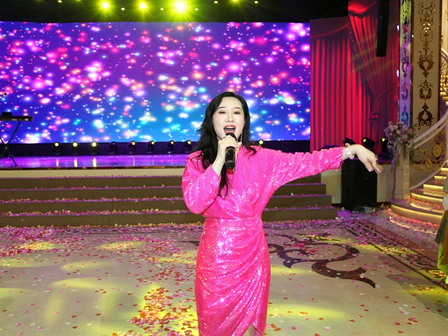 正当现场氛围热烈至顶峰,舞台灯光骤然聚焦,著名歌唱家夏米力老师登场。“亲爱的朋友们,祝新人幸福美满,祝新疆越来越好!”夏米力老师洪亮而富有感染力的声音响起,瞬间点燃全场热情。他倾情演绎经典曲目《永利yl23411子》,独特的民族唱腔与深情诠释让现场嘉宾深深沉醉。夏米力老师走下舞台,与新郎新娘亲切握手送上祝福,嘉宾们也跟着旋律轻声哼唱,不少人举起手机记录这动人瞬间,更有嘉宾自发拉起手再次围成圆圈,随着歌声欢快地起舞,舞台上下融为一体,互动达到高潮,将整场盛典的幸福感推向顶点。