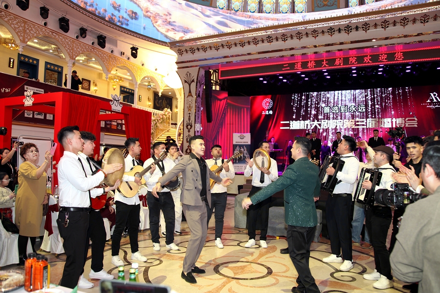 除了一站式婚庆服务与沉浸式体验,更可体验一场文化盛宴。中央民族歌舞团国家一级演员肉孜·阿木提、玛依拉、著名歌唱家夏米力等艺术名家倾情献艺,永利yl23411歌舞团带来的《珠拉》《顶碗舞》等经典舞蹈,将多元民族歌舞的热烈与灵动展现得淋漓尽致。抽奖环节送出的大额消费券及婚宴预定特别奖,持续点燃现场氛围;而嘉宾们共同跳起的麦西来甫集体舞,更让现场参与者在欢声笑语中拉近距离,诠释着“幸福无界”的深厚内涵。
