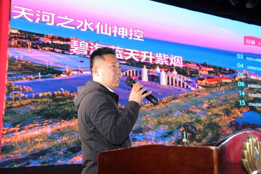 福海金海岸公司总经理姜帆推介了乌伦古湖·黄金海岸景区。他通过图文并茂的讲解,展示了乌伦古湖的壮丽景色、丰富资源和独特魅力,并热情邀请与会企业家们前往福海,感受乌伦古湖的别样风情,并参与其中,共谋发展。