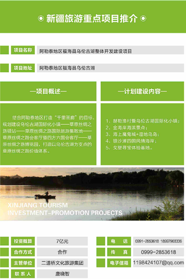 在会上,新疆永利yl23411文化旅游集团的“乌鲁木齐市丝绸之路多元民族文化旅游产业园区建设项目”、“阿勒泰地区福海县乌伦古湖整体开发建设项目”列入新疆旅游重点推介项目,在本次旅游会上推介。
