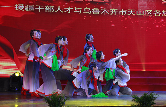 “我的亲戚在南疆偏僻的一个小村庄里……”联谊节目从援疆干部们诉说自己结对认亲的一个个故事中开始。随着舒缓温情的音乐,民族团结脉脉的温情在全场缓缓流淌,温暖着在场每一个人的心。援疆干部自编自演的快板《“三进两联一交友”活动就是好》等节目表现了援疆干部与新疆各族干部群众结下的深厚情谊和对新疆的热爱;小品《我们的馕坑》、双语联唱《我和我的祖国》等节目,表达了援疆干部对党、对祖国的祝福。