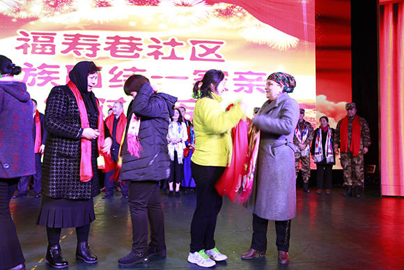 会上,社区干部职工与社区群众交换了认亲卡、表演了丰富多彩的民族团结活动。