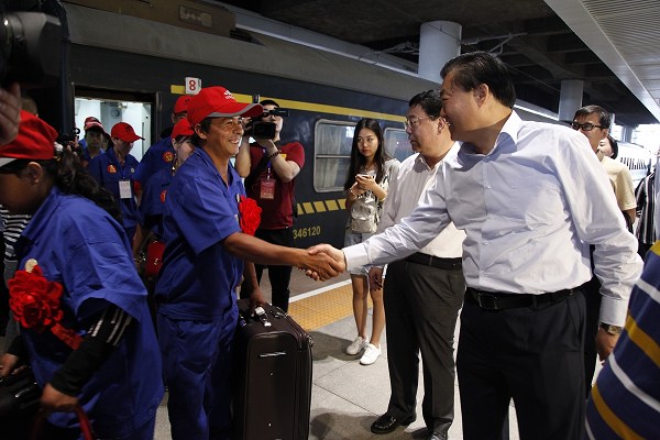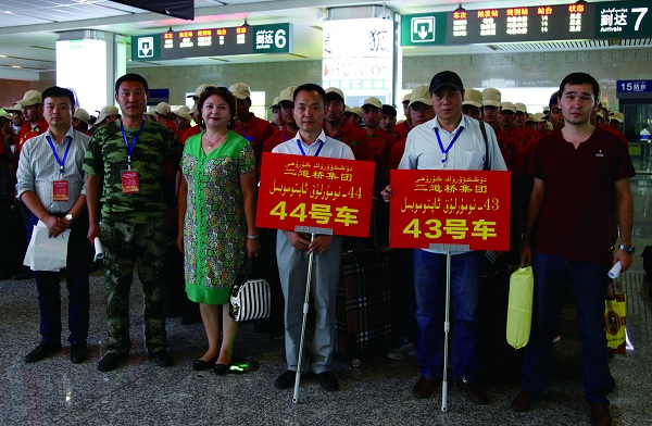 自治区党委常委、组织部部长马学军(左一),自治区政协副主席、工商联主席巨艾提·伊明(左二),永利yl23411文化旅游集团董事长栾立新(左三)在乌鲁木齐新客站迎接喀什、和田富余劳动力转移就业人员。