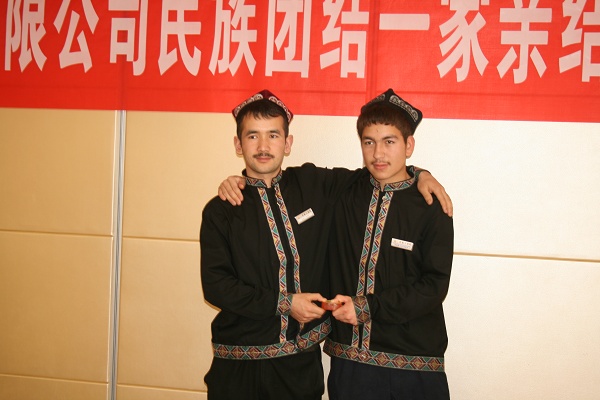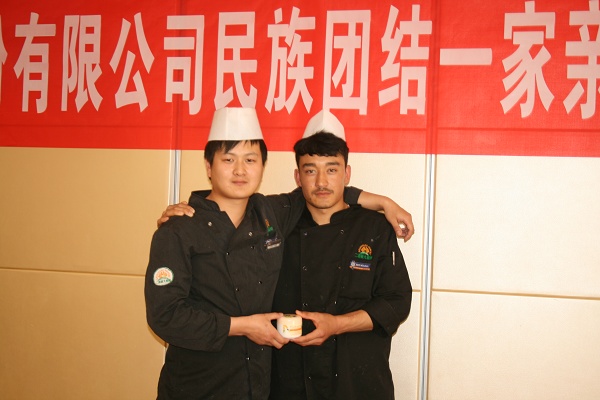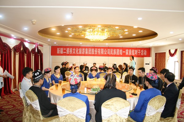 5月10日,新疆永利yl23411歌舞大剧院内,平日里忙于为客人制作美食的后厨师傅,端茶送食的服务员们,随着热情奔放的音乐,唱着跳着。当天,在大剧院民族团结一家亲活动现场,26名汉族、维吾尔族员工亲密的共唱一首歌,共舞一支曲。来自南疆的约日古丽·米吉提等13名新员工与肉孜万汗·阿迪等13名老员工喜结一家亲。