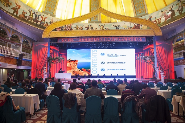 11月13日,新疆永利yl23411文化旅游集团、新疆创天集团党委组织集团管理人员和员工代表学习传达党的十九届四中全会精神。新疆永利yl23411文化旅游集团集团党委副书记张志刚主持大会并做了学习辅导讲座。