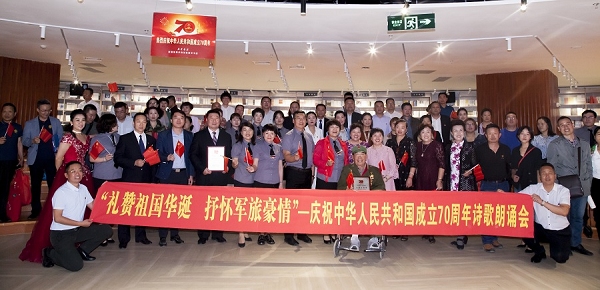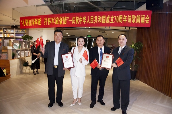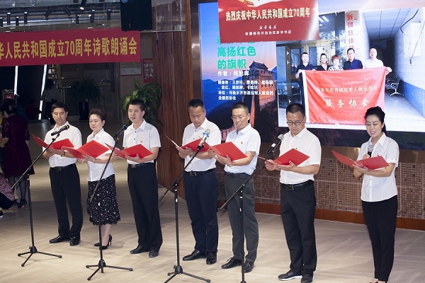 金秋时节,天高云阔,风清水长。在中华人民共和国成立70周年纪念日即将来临之际,在全党第二批“不忘初心、牢记使命”主题教育启动开展之时,9月20日,由乌鲁木齐市退役军人事务局主办、乌鲁木齐市退役军人服务中心、乌鲁木齐市退役军人就业创业服务协会、新疆维吾尔自治区新华书店新华国际图书城共同承办的以“礼赞祖国华诞,抒怀军旅豪情”为主题的迎国庆诗歌朗诵会在新华国际图书城四楼阅览厅热烈举行。新疆永利yl23411文化旅游集团参加朗诵会,参赛作品《退役老兵致敬伟大祖国七十华诞》获得最佳原创奖和优秀节目奖。