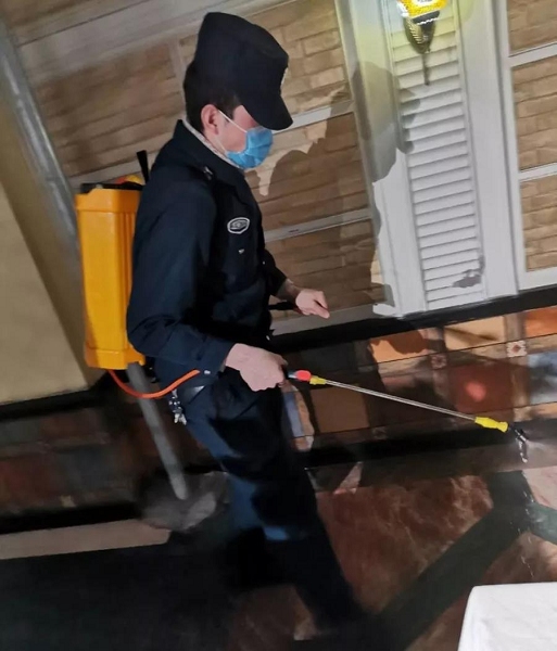 我们安保人员还积极响应党和政府的号召,配合社区,做好防控、安检、测量体温、登记所有进出人员信息并汇报给社区,每天定时定点对整个大剧院大厅、电梯、卫生间、楼道等进行消毒清洁工作。其中女保安阿斯亚除了自己分内工作之外,主动担任了保洁工作,一早起来就开始打扫卫生间、大厅地面、楼梯通道、倒垃圾,并进行消毒等清洁工作。只要是她擦过的门窗、墙面、垃圾桶等物品都一尘不染,给每个人一种焕然一新的感觉。每到晚上大家在宿舍休息的时候,在洗衣间总能看到她在为师傅们搓洗工装的背影,看到她干裂粗糙的双手,有人心疼她说:“你傻呀,让他们自己洗呀!”她却说:“我们如同兄弟姐妹,有困难互相帮助,师傅们从早忙到晚也很辛苦,为他们分担一点力所能及的事也是我心甘情愿的。”听到她的一番话就想起了张书记鼓励我们的话语“你们几个同志就如同女战士一样,奋斗在一线上,为我们每一位员工做了个好榜样。”这些鼓舞人心的话语,使我们以更高标准要求自己做好工作。