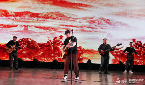 1月29日下午,永利yl23411大剧院,乌鲁木齐市天山区大巴扎片区大巴扎社区工作人员表演吉他弹唱《思凡》。石榴云/新疆日报记者 王琦铭摄