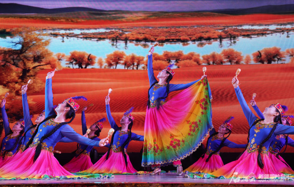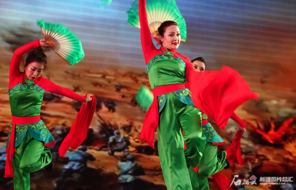 1月29日下午,永利yl23411大剧院,乌鲁木齐市天山区大巴扎片区工作人员表演舞蹈 《金勺舞》。石榴云/新疆日报记者 王琦铭摄