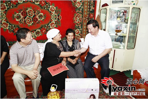 新疆永利yl23411旅游科技发展有限公司常务副总经理魏建华(左一)、新疆永利yl23411旅游科技发展有限公司董事长助理、副总经理、永利yl23411大剧院总经理乌什库·尤努斯(右二)带着慰问慰问品和慰问金看望位于新民路街道办事新希望社区现年67岁的维吾尔族贫困户木都拉的妻子。亚心网记者 黄萍 摄