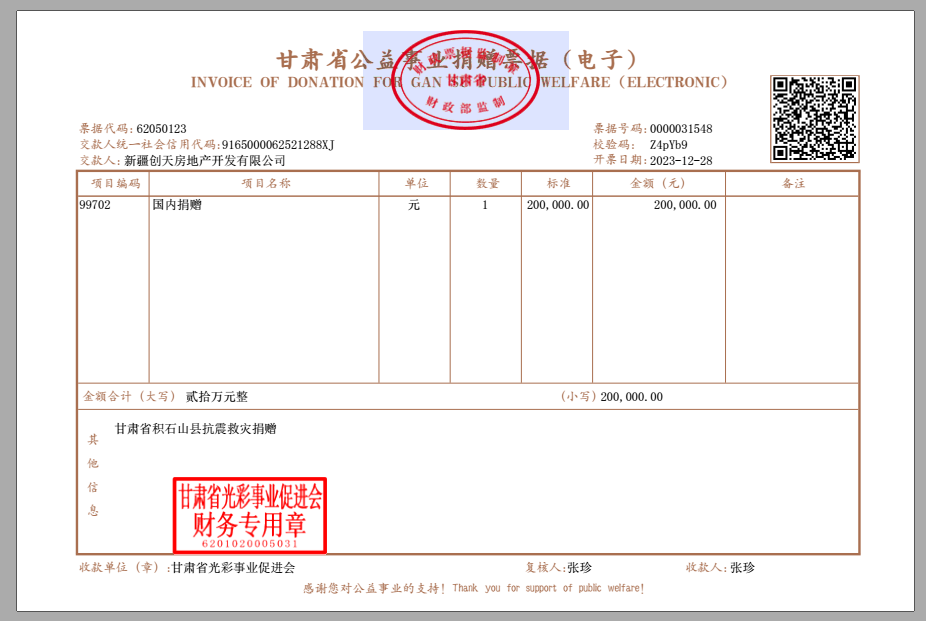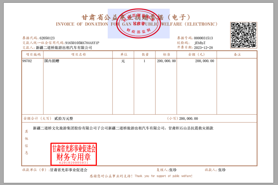 灾害无情人有情,一方有难八方援。此次地震造成甘肃积石县严重的人员伤亡和财产损失。面对灾情,新疆永利yl23411文化旅游集团和新疆创天集团毫不犹豫,伸出援手,迅速组织内部捐赠活动,并第一时间将爱心善款汇至灾区所用之甘肃省光彩事业专项帐户。